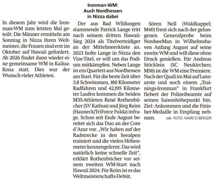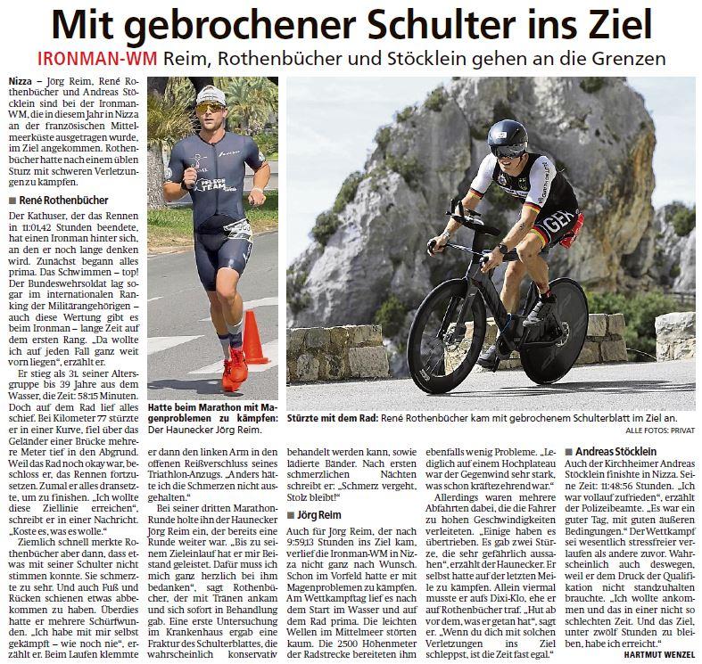 Unser Sportkamerad Andreas Stöcklein ist bei der Ironman Weltmeisterschaft der Männer in Nizza an den Start gegangen. Die Männer machen letztmals in Nizza den WTC Ironman Wettbewerb. Ab nächstem Jahr findet der Wettbewerb wieder auf Hawaii statt. Bericht von Andreas folg bestimmt bald .....