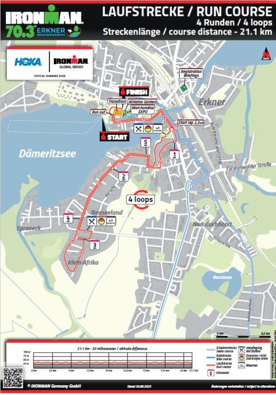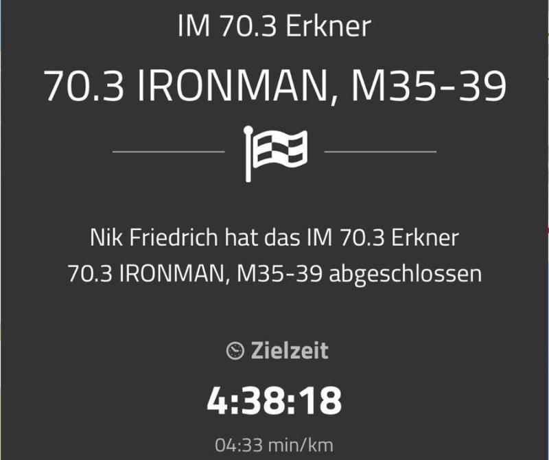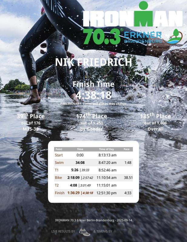 Das Wetter war sehr regnerisch und windig am Rennmorgen. Bei 13 Grad Außentemperatur und 19,1 Grad Wassertemperatur war das Schwimmen sehr angenehm. Hatte allerdings Probleme bei der Orientierung und es war ein ziemliches gekloppe während des Schwimmens. Nach 34 Minuten war ich aber dann doch recht zufrieden. Wechsel aufs Rad lief super. Die ersten Kilometer führen durch die Stadt Erkner, durch den Dauerregen war es ziemlich glatt auf den Straßen. Nachdem ich bei Kilometer 4 die ersten beiden Athleten am Streckenrand liegen gesehen hatte, war für mich „Safety First“ angesagt. Die Verpflegung lief echt gut und ich konnte dann trotz der Bedingungen gut pushen und richtig viele Plätze gut machen. Nach 2h18min abgestiegen. Wahnsinn! Damit hatte ich tatsächlich nicht gerechnet. In T2 nochmal frische trockene Socken angezogen und dann ging es zum Laufen. Ich habe mir bewusst vorgenommen die erste Runde nur nach Gefühl zu laufen. Als ich dann das erste Mal auf die Uhr schaute, konnte ich es auch dort kaum glauben…so schnell bin ich im Training nicht gelaufen. 😅 So konnte ich Runde für Runde die Pace halten. In der vierten und letzten Runde wollte ich dann nochmal versuchen anzuziehen aber schneller ging es nicht mehr…aber auch nicht langsamer. 😉 Der Moment, auf die Finishline zu kommen war wirklich Atemberaubend. Als ich oben meine Finishtime gesehen hatte war tatsächlich mein erster Gedanke das kann unmöglich stimmen. 🧐 Aber beim Abdrücken der Uhr stand das gleiche Ergebnis. 4h38! Ziel war sub5…und das war es…und zwar deutlich! 💪🏻 Unterm Strich war es ein absoluter Sahnetag bei schwierigen Bedingungen. Ich bin Mega glücklich und zufrieden! Vielen Dank an Marc, der mich nach meinem emotionalen Tiefpunkt der Saison, in Erlangen, rausgeholt und 100 prozentig vorbereitet hat. Jetzt geht es in die Saisonpause um dann mit frischem Kopf in die Vorbereitung für den IRONMAN Frankfurt zu starten.