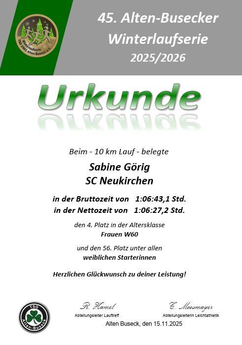 Unsere Sportkameradin Sabine Görig ist in Alten Busek bei der Winterlaufserie gestartet. Sabine; Ich war am Samstag in Buseck. 1. Lauf der Winterlaufserie. Sehr anspruchsvolle Strecke mit Teilnehmerrekord. 2. Lauf mit 15 km findet im Dezember statt und 3. Lauf mit 21,1 km im Januar.