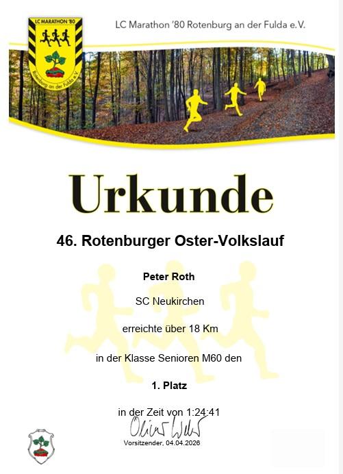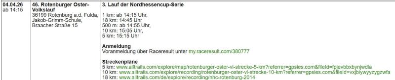 Unser sportlichen Ehepaar Angelika und Peter Siebert sind in Rotenburg beim Osterlauf im Rahmen des Nordhessen Cup die 4,9 km gelaufen. Peter R. hat die 18 km unter seine Laufschuhe genommen. LCM-OsterlaufRund um Braach findet jedes Jahr der Rotenburger Oster-Volkslauf statt. Alle Infos zu den Lauf-Cups findet ihr unten über die gelben Schaltflächen. Der Rotenburger Oster-Volkslauf findet bereits zum 46. Mal statt. Im Vordergrund stehen Spaß an der Bewegung und Breitensport. Start und Ziel ist die Bernhard-Faust-Sporthalle in 36199 Rotenburg a. d. Fulda, Braacher Straße 13.