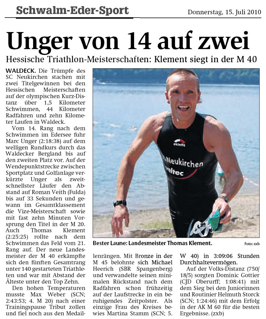 Tri Edersee: Marc Unger hat einen super Tag erwischt und belegt auf der olympischen Distanz den 2 Gesamtplatz. Damit ist Marc gleichzeitig Hessenmeister AK20, Glückwunsch. Mit Gesamtplatz 5 hat Thomas Klement ebenfalls eine ganz starke Vorstellung abgeliefert. Thomas setzt sich gegen 22 Athleten seiner Altersklasse durch, er wird Hessenmeister AK40. Max Weber absolviert nach Radsturz und Klausurstress ein kluges Rennen und riskiert auf der abschließenden Laufstrecke nichts. Der Formaufbau für die noch anstehenden Wettkämpfe steht im Vordergrund. Martina Stamm wird 11. (5.AK). Im Sprint belegt Helmuth Storck mit knapp 2 Minuten Vorsprung Platz 1 in der AK60. Den Grundstein zum Sieg legt er im !!!Schwimmen!!! (Helmuth, hattest du Flossen an :-)) Ein ausführlicher Bericht folgt .....