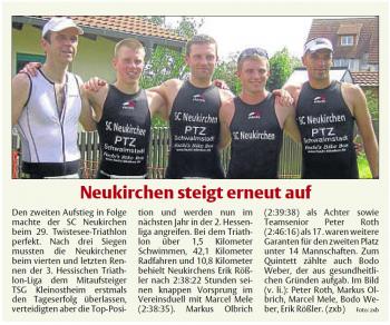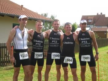 Beim schwimmen konnte Peter seine Stärke ausspielen und als erster der SCN Athleten aus dem Wasser steigen. Bodo und Erik kamen zeitgleich aus dem Twistesee, dicht gefolgt von Markus. Marcel bekam kurz vor der Wendeboje einen heftigen Schlag in den Nacken, so dass ihm schwindelig wurde aber mit Problemen das Schwimmen trotzdem beenden konnte. Marcel konnte hier mit der zweitschnellsten Radzeit der Liga wieder Boden gut machen, so dass er als dritter der SCN Athleten in die Wechselzone kam. Kurz hinter ihm kamen Markus und Peter in die Wechselzone. Mit der zweit schnellsten Laufzeit der Liga konnte Marcel bis in die Top 5 laufen. Erik ließ sich aber den Vereinsinternen Spitzenplatz nicht nehmen und konnte mit 13 Sekunden vor Marcel die Ziellinie überqueren. Markus der beim Laufen super drauf war konnte bis auf eine Minute an Marcel und Erik heran laufen. Peter der neben dem Schwimmen auch beim Laufen seine gewohnte Stärke ausspielte machte den zweiten Platz der Liga perfekt. Leider musste Bodo das Laufen vorzeitig beenden, da er seit dem Schwimmen mit Problemen zu kämpfen hatte und beim Laufen diesen nun Tribut zollen musste.