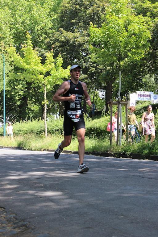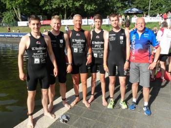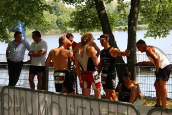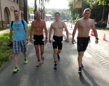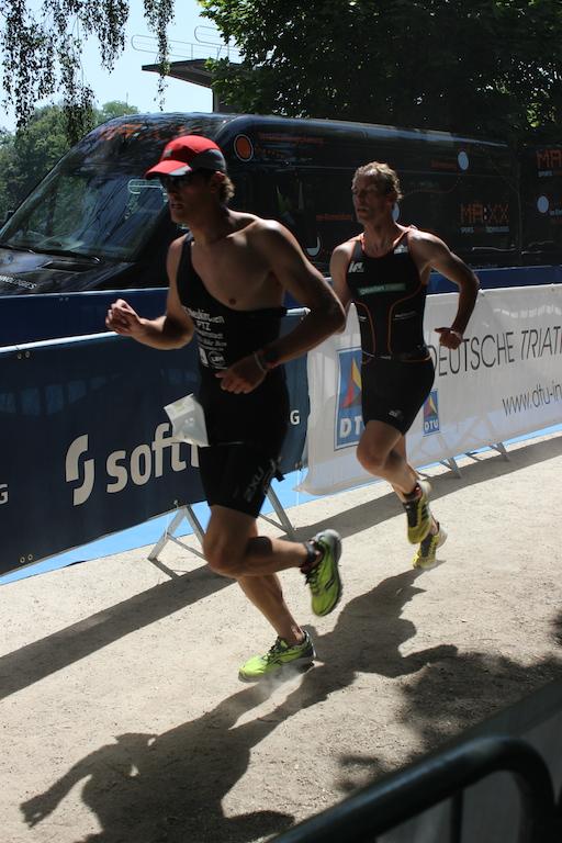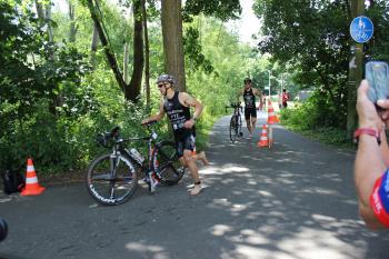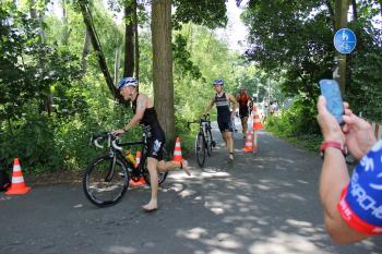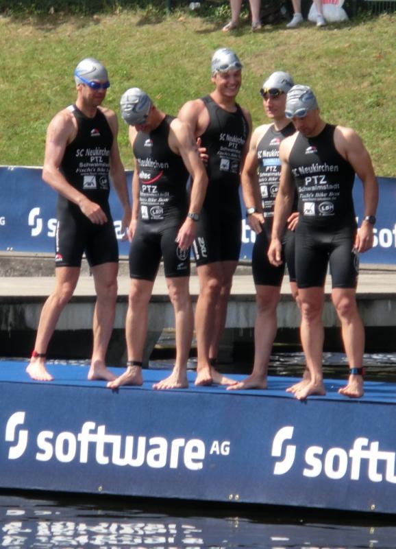 Um 11:15 Uhr erfolgte der Start der zweiten Bundesliga. Marc Unger, Martin Huhndorf, Thomas Klement, Peter Roth und Fabian Pretz. Nach einer guten Schwimmeinheit konnte Marc gleich in der großen Spitzengruppe mit auf die Radstrecke. (Info: Bundesliga Windschattenfreigabe). Martin verlor beim Radaufstieg einen Schuh und verpasste somit den Anschluß an die erste Gruppe, konnte aber in der zweiten Gruppe mitfahren, die in der zweiten Runde dank einem ehemaligen Vereinsmitglied auf die erste Gruppe auffuhr. Thomas und Fabi erwischten eine weitere größere Gruppe, die unser "alte Mann" zum Laufwechsel anführte. Peter hatte ebenfalls eine Gruppe erwischt und somit konnten alle fünf einen guten Radsplit absolvieren. Zur Erleichterung aller Fans ohne Sturz. :) Kein noch so super toll gedrehtes Video kann zeigen, was da in den großen Gruppen für ein Tempo gefahren wird, irre, da ist man froh, wenn alle gesund vom Rad steigen. In der mitlerweile sehr heißen Mittagssonne zeigten alle fünf Athleten einen starken Lauf. Es war recht laut um das Woog Gelände, die Anfeuerungsrufe waren im Gegensatz zum Vormittag sehr Hoch. In dieser Wettkampfwertung wurden diesmal nicht die Endzeiten addiert sondern die Platzierungen und da wurde gefeitet, gelaufen geschrien gebissen und geweint... ;) Alle Reserven wurden aus dem Körper geholt und okay ich schreib es kurz auf und hoffe Fabi ist damit einverstanden..... Auf den letzten Laufmetern angespornt von gefühlten 100 SC N Anhängern hatte Fabi zwei gegnerische Athletn vor sich und er gab mächtig Gas....... zehn Meter vor der Zielline, dreht er sich nach hinten um und sackt urplötzlich nach unten weg..... kurz dahinter die eben erst überholten "Gegner" .... und was soll ich schreiben die laufen nicht an Fabi vorbei, sie helfen ihm auf und lassen ihn als "Erstern" die Ziellinie überqueren...... Eine solche Geste der Hammer!!! RESPEKT an die die Sportkammeraden des Gealan Tri Team HL Hof und SV Würzburg 05!!! Danach natürlich Aufregung, aber alle kümmerten sich mehr als "mütterlich" ;) um Fabi. Leider blieb ihm der Weg ins nahegelegene Krankenhaus nicht erspart. Eine tolle Geste von Fabi, er liegt auf der Trage nimmt seine Arme nach oben und erwiedert den anhaltenden Ablauss der SC N Anhänger!!! Leider haben wir es auch diesmal nicht geschafft, alle Athleten wieder mit nach Hause zu nehmen. Es war ein toller Wettkampf der uns gezeigt hat, dass ihr mitteinander kämpft und es lohnt sich euch zu unterstützen... wichtig es geht euch ALLEN soweit gut und die Belohnung für alle Zehn jeweils einen achten Platz in den Liga Wetungen!!! Glückwunsch!!!