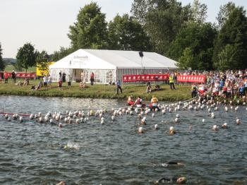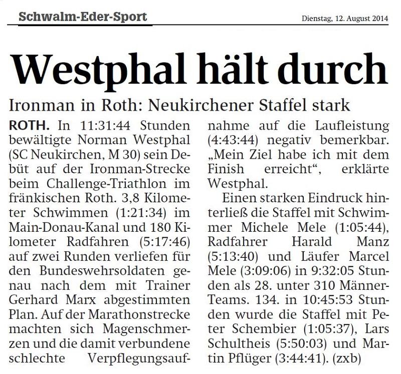 Pünktlich zum 30- jährigen Geburtstag der Challenge ROTH am 20.07.2014 zeigte sich auch das Wetter am Rennwochenende von seiner sommerlichen Seite; bereits um 10:30 wurde die 30°C- Marke geknackt, mehr sollte folgen. Unter den mehr als 5000 Einzel- und Staffelteilnehmern befanden sich der ein odder andere Triathlon- VIP; um wirklich nur einige zu nennen: Timo Bracht, Yvonne van Vlerken, Nils Fommhold, Mirinda Carfrae, James Cunnama, Caroline Steffen, Dirk Bockel, Luke McKenzie, Julia Gajer, Rachel Joyce und viele weitere mehr. Dieses echte TOP Starterfeld wurde durch den Chef der Challenge ROTH persönlich, Felix Walchshöfer, komplettiert. Bei seiner persönlich dritten Langdistanz wollte er "seinen" Wettkampf aus Athleten- Sicht wahrnehmen und die Chance nutzen sich bei den Tausenden von Helfern persönlich zu bedanken. An der Strecke selbst halfen ca. 5000 Menschen, meist freiwillig bei der Organisation. Diese Zahl konnte nur noch durch den diesjährigen Zuschauerrekord von insgesamt 200.000 Menschen an den Strecken, allein mindestens 20.000 Leuten am Solarer Berg getopt werden. Neben den zahllosen Einzelschicksalen abseits der Strecken, von Hochzeiten, Altersrekorden, Heiratsanträgen, Familien und Kindern beim Zieleinlauf usw., was insgesamt für den doch familiären Charakter der Veranstaltung spricht, nun meine Geschichte: Mein längster Tag des Jahres begann um 03:45 nach doch guten 5 Stunden durchwachsenem Schlaf in der Kaserne in Roth. Da der tagsüber gekaufte Joghurt die Hitze am Tage nicht überstanden hatte, fiel das Frühstück etwas bescheidender aus. (Müsli mit Wasser is bäh, deswegen: nein!!!) 04:30: Marschbeginn mit dem Auto in Richtung Schwimmstart. Pünktlich um 04:50 konnte ich mit meiner zum Helfer bestellten Freundin den 2,50 teuren zugewiesenen Parkplatz erreichen, so dass ich mit dem Öffnen der Wechselzone um 05:00 in Richtung meines vortags eingecheckten Rades betrat. Mein Platz befand sich taktisch klug ausgerichtet in unmittelbarer Nähe der 100.000 Dixi's. Es war so ziemlich der abgelegenste Platz für Einzelstarter. Zumindest war meine Freundin (jenseits des Bauzauns) nicht weit und ich hatte von Anfang an Betreuung. Letzte Checks am Rad: Luft, Essen, Trinken, Panne und raus aus der Zone. 06:30 war dann erster Start für die TOP 50 Männer, TOP 20 Frauen, Jubiläumsteilnehmer sowie schnelle AK- Athleten. Da mein Start um 07:40 noch gut eine Stunde hin war, konnte ich den Schwimmstart noch direkt und ohne viel eigene Aufregung (*hehe*) hautnah am Ufer miterleben. Unglaublich die Gänsehautatmosphäre am Main- Donau- Kanal. Überall jubelnde Menschen, Laola- Wellen für die Starter beim Einstieg ins Wasser, donnernde Musik,.... 07:40: Beobachtet von tausenden Zuschauern vom Ufer, vom gegenüberliegenden Ufer, von der Kanalbrücke war es dann soweit: der Start in "meinen" Tag. Dem allgemeinen Geschlage und Gewühle beim Wasserstart konnte ich weitenstgehend entgehen, so dass ich ziemlich schnell in meinen Rhythmus fand und mir in Ruhe gute orientierungshilfen suchen konnte. Ich kam überraschenderweise an die Spitzengruppe meiner Startgruppe heran und konnte mich dort auch etablieren, bis ich von links und rechts gleichzeitig in die Mangel genommen wurde. Nachdem ich den Kanal um eine Lungenfüllung Wasser beraubt hatte, brauchte ich eine Weile bis ich mich wieder gefangen hatte. Gerhard im Ohr: "Ruhig Junge, atmen, Rhythmus wieder finden und weiter, komm!!!! trieb ich eine gefühlte Ewigkeit auf dem Rücken bis ich den Worten Taten folgen ließ. Schnell wieder Rhythmus aufgenommen und weiter. Die 1. Schwimmwende kam und mit ihr das nächste Gedränge. Wachsamer und nahkampfbereit konnte ich problemlos wenden; 1500m waren geschafft. Wahnsinn was am Schwimmstart und auf der Brücke los ist; aus Wassersicht echt ein wenig geil!!! Respekt Frankenvolk!!! 400 Meter vor dem Ausstieg war ich stumpf und inzwischen auch abgebrüht genug nicht mehr nur Nehmerqualtäten im Nahkampf zu zeigen. Hab jetzt bestimmt ein paar englisch- sprachige (fluchende) Freunde mehr, ...., aber was soll's, war schließlich Notwehr. Nach überraschenden 1:21 aus dem Wasser, ab auf's Rad. Alles schön nach Matchplan, wie man im Fußball so schön sagt, Beine finden, essen, Wasser aus den letzten Ritzen ablassen und auf geht's. Erste Runde ohne viel Druck zu machen "angerollt". Wind stand relativ flau, aber günstig über Greding. Die Ballerstrecke Thalmässing- Greding demnach nicht so schnell wie es hätte sein können. Neben den zahlreichen Stimmungsnestern präsentierte sich Thalmässing u.a. mit Helene Fischer (vom Band) in Gänsehaut- Manier. Die erste große Aufgabe lauerte dann in Greding: Stimmung pur, höchste Ansteckungsgefahr. Da war es wieder: Gerhard's Stimme: "Kopf einschalten, es ist verdammt heiß, es ist Dein erster IM, du willst noch nen Marathon laufen!!!" Gut, also Druck raus, Puls beobachten, Stimmung genießen ohne Abzudrehen! Hinter Greding dann, mit flachem, günstigen Wind ging's bisl flotter weiter zum nächsten Highlight: Solarer Berg! Ich weiß ehrlich gesagt nicht, wie man das beschreiben kann, aber wenn man als Triathlet bei der Challenge das erste Mal in seinem Leben Solar hochfährt, ist das Emotion pur!!!! 20.000 Menschen in einer Gasse, die man sich selbst bahnen muss, aufgestellt, peitschen einen da den Berg hoch, WAHNSINN!!!! Wer das noch nicht gesehen hat, schaut euch unbedingt Bilder oder Videos an. Alp d'Huez lässt grüßen. Aber ich bin ja nicht zum Spaß hier, sondern hab nen Auftrag zu erfüllen. Erste Runde durch: voll im Matchplan. Beine gut; hatte schonmal bessere, aber trotzdem gut. Mit Beginn der zweiten Runde hörte auch die leichte Brise auf zu wehen, und die Sonne brannte jetzt richtig über dem Asphalt. Der Fahrtwind fühlte sich nur noch an wie ein Fön. Weiter geht's! Ein zweites Mal Thalmässing (jetzt schneller, da windstill), ein zweites Mal Greding, absolut im grünen Bereich. Solarer Berg Teil 2: diesmal ließ ich es mir nicht 