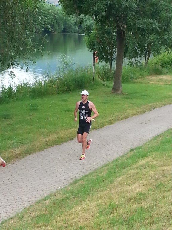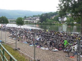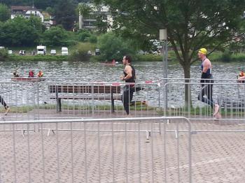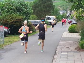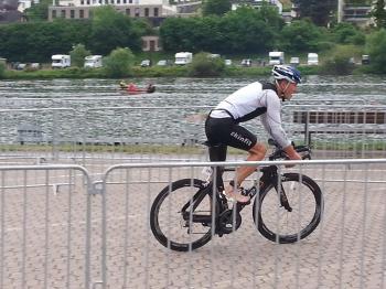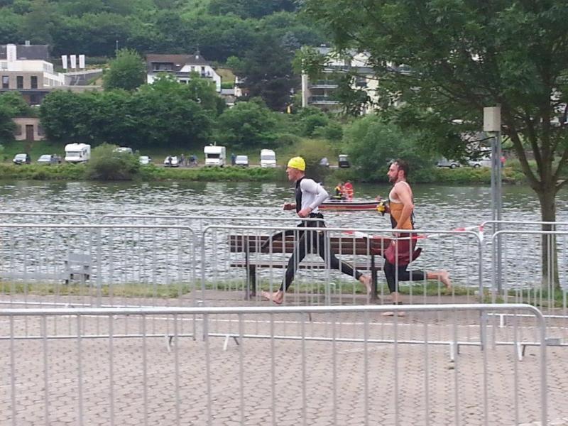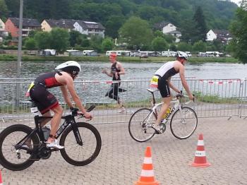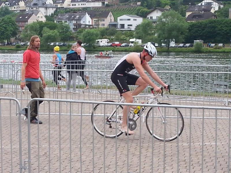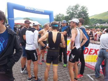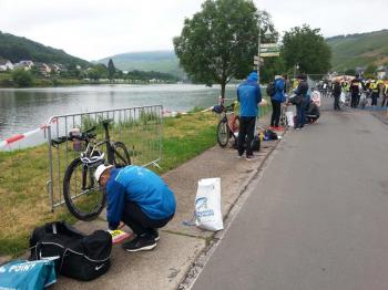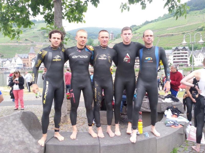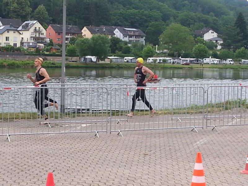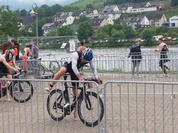 Zum zweiten Regionalligawettkampf ging es an und in die Mosel. Wie in Darmstadt stand eine Sprintdistanz auf dem Programm. Bei 19° Wassertemperatur schwammen die Athleten mit Neoprenanzug zunächst 750 m moselabwärts. Martin konnte Dank starkem Wechsel Peter in der Wechselzone überholen, Thomas folgte dicht auf. Entgegen der Wettkampfausschreibung entartete der Radsplit über 20 km zum Windschattenrennen, so dass die ersten Radgruppen bevorzugt waren und einzelne Radler kaum eine Chance hatten. Philipp, der ein tolles Regionalligadebut ablieferte und Junior Jonas, bereits mit Erfahrungen aus der 2. Bundesliga ausgestattet, kamen hier nicht mehr heran. Auf der flachen 5 km-Laufstrecke entlang der Mosel fiel dann die Entscheidung mit harten Positionskämpfen, denn es zählte ligaüblich nicht die Zeit, sondern die Platzziffer. Martin am Ende starker 6. Thomas und Peter folgten als 20. bzw. 24. Philipp als 43. in der Wertung und Jonas als 52. komplettierten das gute Mannschaftsresultat. Mit Rang 5 nach dem 4. Platz in Darmstadt konnte Gerhard mit seinem Team zufrieden die Heimreise antreten. Dank auch an die Luxemburg-Starter, die nach ihrem anstrengenden Rennen eine Super-Unterstützung an die Strecke mitbrachten. Vielleicht kommen noch ein paar Bilder......