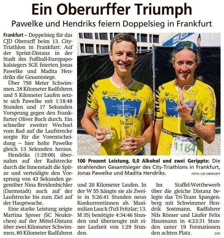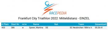 Martina Spreer hat in Frankfurt am City Triathlon teilgenommen, die 2 km swim, 80 km bike und die 20 km run absoliert und einen hervorragenden 2. Platz in ihrer AK gewonnen.