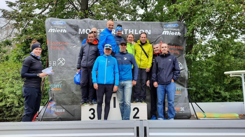 Unsere Sportkameradin Sandra starten heute mit den Sportkameraden Thomas, Michael und Axel beim Moret Tri mit der Olympischer Distanz, um in der Seniorenliga 2 die Fahne des SC Neukirchen zu vertreten. Steffen Deubel wagt sich heute an eine Mitteldistanz. Zur Unterstützung und als Brichterstatterin ist Diana dabei. Es ist der vierte und letzte Seniorenliga Triathlon für diese Saison 2022 und wir stehen bis vor diesem Moret Tri von Babenhausen auf dem zweiten Tabellenplatz der SL 2 von 11 Mannschaften in dieser Saison. Durch die tollen Ergebnisse der vergangenen Wettkämpfe in Fritzlar bei dem Ederauen Tri (Sprint) mit Platz 4 / Waldeck Edersee Tri (OD) mit Platz 1 / Viernheim Tri (Sprint) mit Platz 3 wurde der Grundstein gelegt. Da wir nun auf dem Tabellenplatz ges. Platz 2 stehen und in der SL 2 die ersten beiden Mannschaften die Möglichkeit haben, in die SL 1 aufzusteigen, haben wir uns gedacht, es wäre doch toll, den zweiten Tab.Platz nun mit dem Moret Tri in der OD so gut wie möglich zu verteidigen, um eine Chance zum Aufstieg zu haben. Das Wetter war nun nicht das ideale Triathlonwetter und dann noch für eine OD mit einer Außentemperatur von kühlen, windigen 10-14 °C und Wassertemperatur von 19,5 °C. Wir hofften auf eine Absage vom Schwimmen der 1,5 km Strecke! Es mussten nun ja alle Sportler durch dieses ungemütliche Wetter und unser Steffen hatte dabei auch noch eine Mitteldistanz zu bewältigen. Daher war das Gejammer von uns dezenter! Jeder von uns nahm sich vor, beim Wechsel aufs Rad, sich gut abzutrocknen und warm anzuziehen...der eine mehr und der/die andere weniger!!! Am Ende vom Wettkampf haben wir, Axel/Thomas/Michael/Sandra, super Einzelergebnisse erzielt und somit den Tagesplatz 2 erkämpft. Wahnsinn, wirklich toll bei diesen Bedingungen! Bei der Siegerehrung der Team-Tagesplatzierung wurde sofort im Anschluss auch die Gesamtehrung der SL 2 vom HTV durchgeführt. Wir waren dann total überrascht, dass wir auf dem Ges. Platz 1 gekommen waren. Mit unseren netten Nachbarvereinskollegen aus Fuldatal hatten wir zwar die gleiche Wertungspunktzahl erreicht, aber unsere Platzziffer war niedriger errechnet und daher landeten wir nun auf Platz 1. Super, der Aufstieg wurde dadurch noch perfekter! Ein großes Dankeschön an alle Starter der SL 2 mit den SC N´lerinnen Diana, Martina und Sandra, sowie unsere SC N´lern Axel, Thomas, Peter R., Stöcki und Armin. Vielen Dank auch an unseren Trainer Marc, der uns sehr gut auf jeden Wettkampf vorbereitet hatte. Es hat auf jeden Fall wieder richtig Spass gemacht, im Team an den Start zu gehen. Danke auch an unsere Sponsoren, für die weitere Unterstützung. Bericht von Steffen zu seiner Mitteldistanz. Nach dem Wettkampf ist vor dem Wettkampf... vor 2 Wochen über die Mitteldistanz beim Carglass Triathlon in Köln gestartet, stand am Wochenende nun die nächste Mitteldistanz beim Moret Triathlon an... Um 4:15 Uhr Richtung Babenhausen aufgebrochen. Das Wetter dämpfte ein wenig die Euphorie aber man konnte sich bereits seit Tagen darauf einstellen. 7:30 Uhr erfolgte der Wasserstart über 2 Kilometer, die ich konstant in 35 Minuten durchschwimmen konnte. Anschließend aufs Rad, wo die ersten Kilometer sehr hart waren... die Kälte und der Wind machten mir das Leben ordentlich schwer. Dies war aber auch irgendwann überstanden und am Ende stand eine Zeit von 2 h 22 min über 84 Kilometer. Damit war ich sehr zufrieden. Runter vom Rad, rein in die Laufschuhe... Im Gegensatz zur zweiten Disziplin fand ich beim Laufen gleich meinen Rhythmus und ich spulte Kilometer für Kilometer ab. Allerdings machten sich dann bei Kilometer 13 üble Bauchkrämpfe bemerkbar. Jetzt weiß ich was das bedeutet... Musste 2-3 kurze Stopps einlegen. Zum Glück legten sich die Schmerzen und ich konnte den Halbmarathon in einer Zeit von 1 h 42 Minuten beenden. Unterm Strich stand dann ein Finish von 4 h 49 min, womit ich sehr zufrieden bin. Ein Glückwunsch geht auch an die Ligatruppe zum Aufstieg!