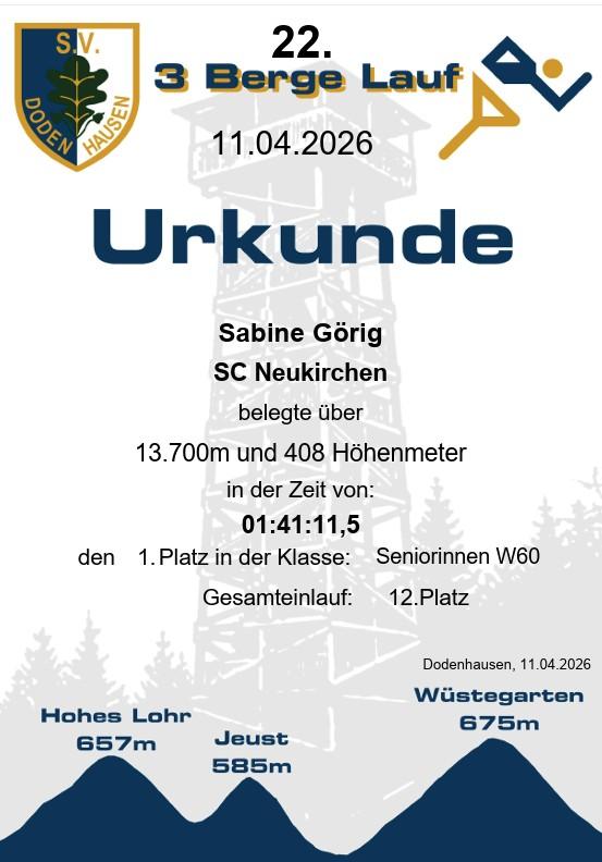 Sabine Görig ist mit ihrem Mann Uwe in Dodenhausen beim 3 Bergelauf gestartet. Uwe startet für Schrecksbach. Der 3-Berge-Lauf des SV Blau-Weiß Dodenhausen ist ein anspruchsvoller Landschaftslauf im Kellerwald, der über die Gipfel Hohes Lohr, Jeust und Wüstegarten führt. Hauptlauf ist der 26,2-km-Speedtrail mit ca. 950 Höhenmetern. Zudem werden eine Mittelstrecke (13,7 km, ca. 370 HM) und eine Kurzstrecke (4,3 km, ca. 130 HM) angeboten.