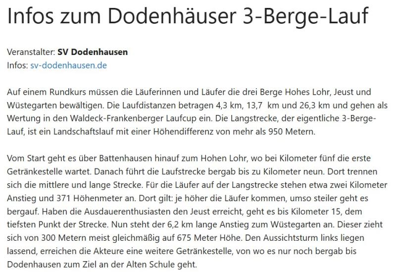 Sabine Görig ist mit ihrem Mann Uwe in Dodenhausen beim 3 Bergelauf gestartet. Uwe startet für Schrecksbach. Der 3-Berge-Lauf des SV Blau-Weiß Dodenhausen ist ein anspruchsvoller Landschaftslauf im Kellerwald, der über die Gipfel Hohes Lohr, Jeust und Wüstegarten führt. Hauptlauf ist der 26,2-km-Speedtrail mit ca. 950 Höhenmetern. Zudem werden eine Mittelstrecke (13,7 km, ca. 370 HM) und eine Kurzstrecke (4,3 km, ca. 130 HM) angeboten.